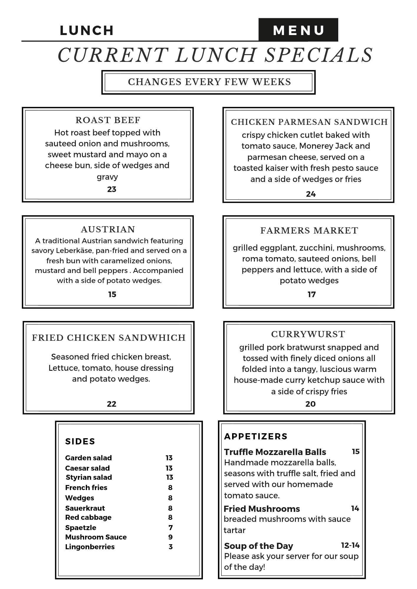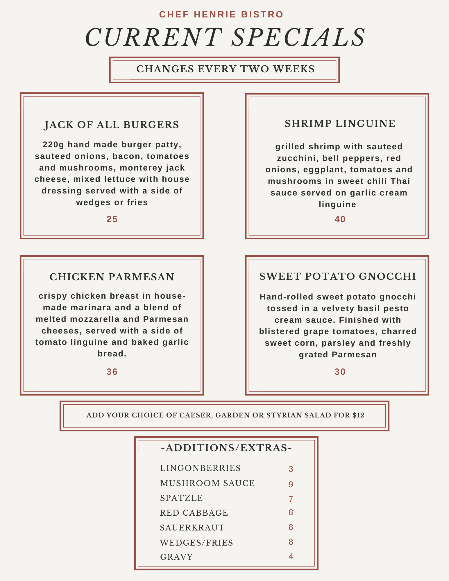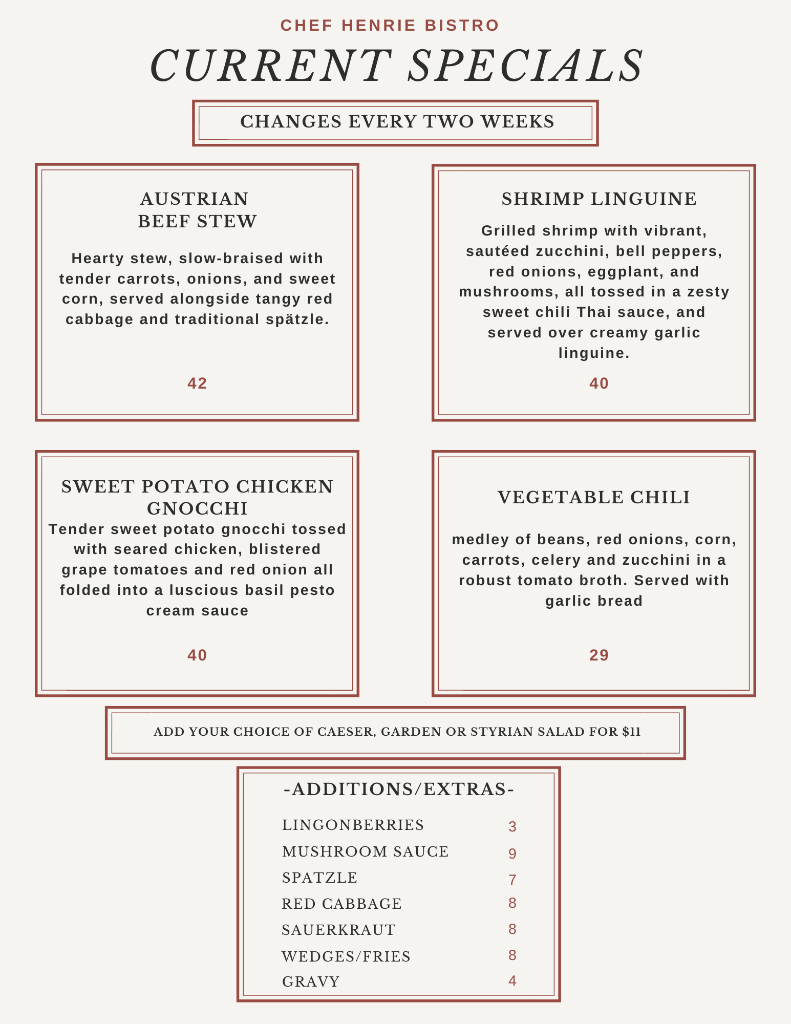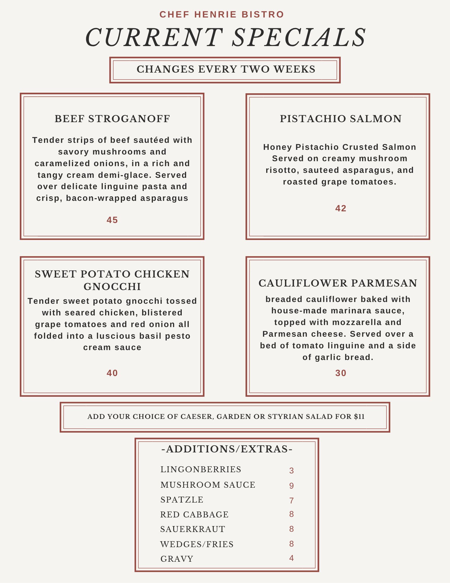 Our Menu changes from week to week. Online Menu is updated every Tuesday.