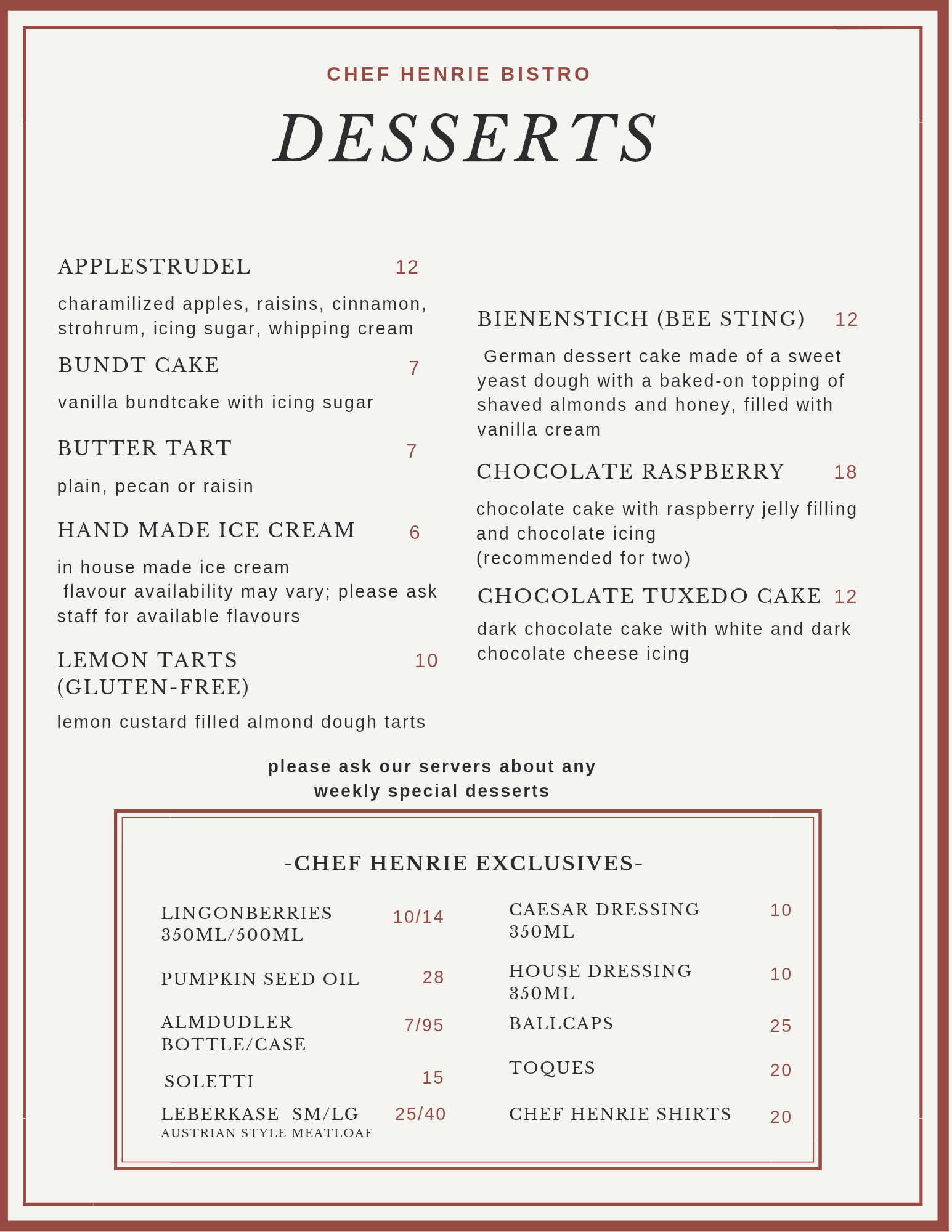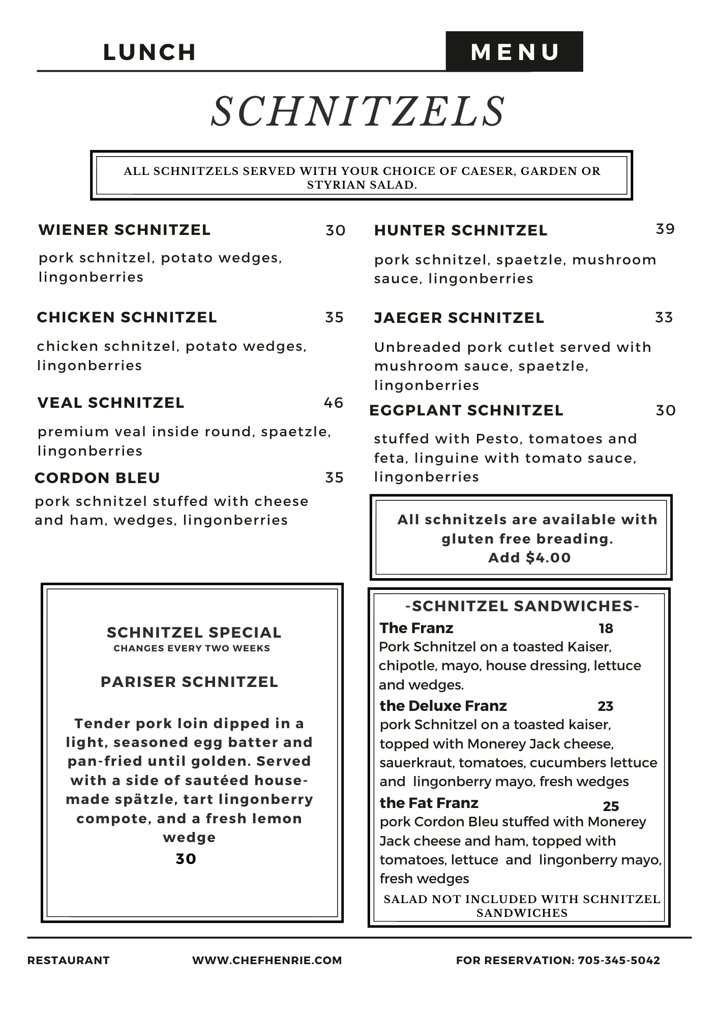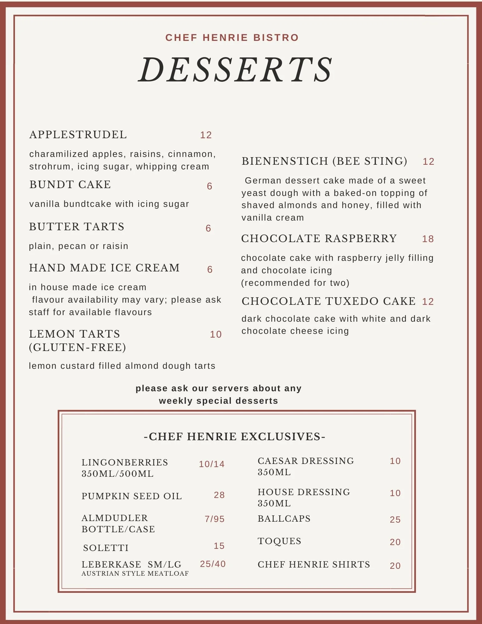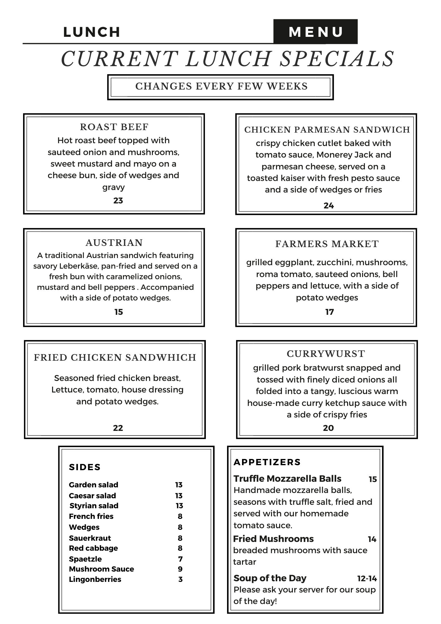Our Menu changes from week to week. Online Menu is updated every Tuesday.